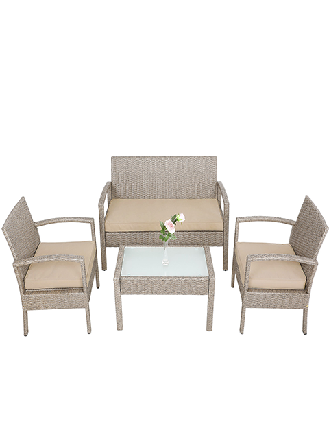 This 3+1 rattan chair and table is made of galvanized synthetic material and rattan, which is cream in color, with a rough stringed surface.