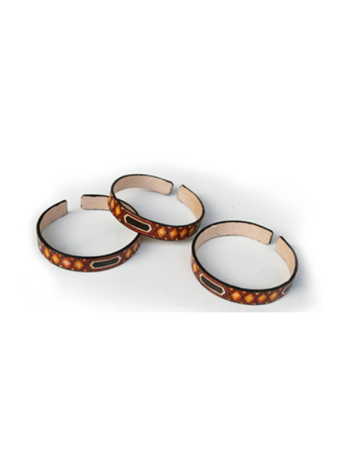 This bracelet is made of leather, and has a geometric motif, orange-yellow-brown and black colors. This bracelet is also coated with aqua lacquer. so that it adds to the beauty when used