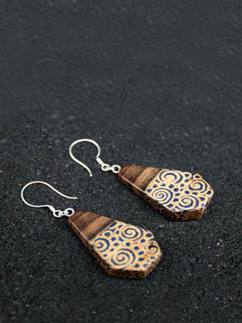 These earrings can be used by everyone. These earrings have an elegant impression because they wear motifs. Earring made from Sonokeling wood (Blackwood), and has the shape trapesium with silver hook, flower motif batiked, blue color, aqua lacquer coating.